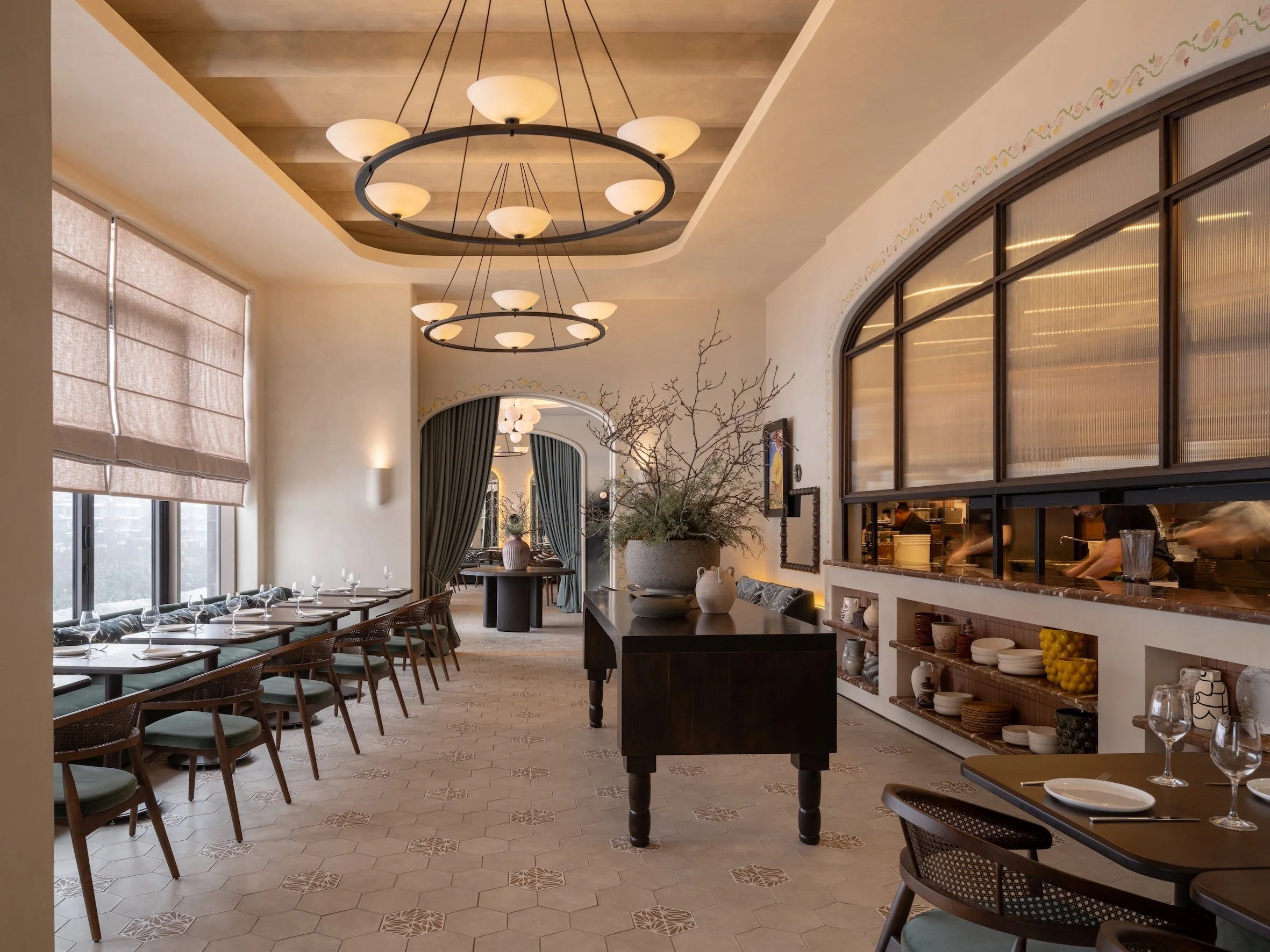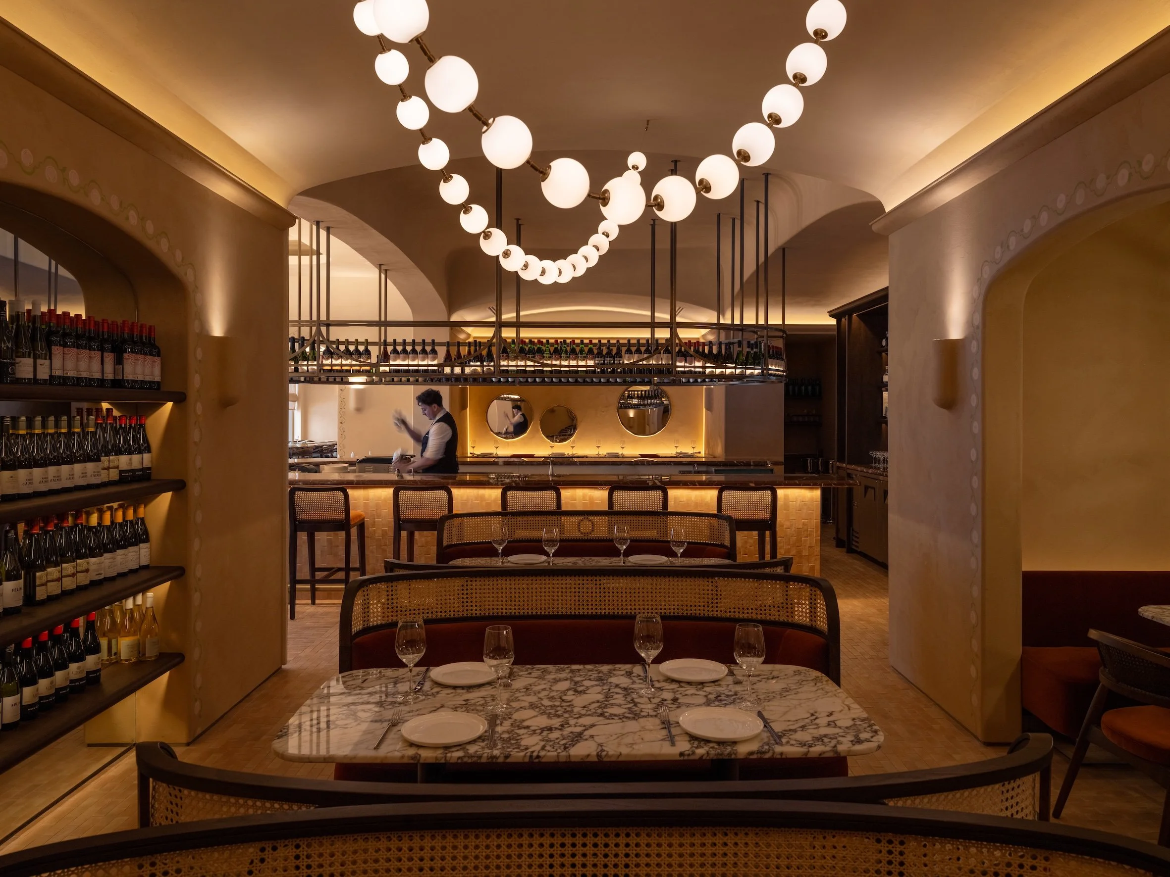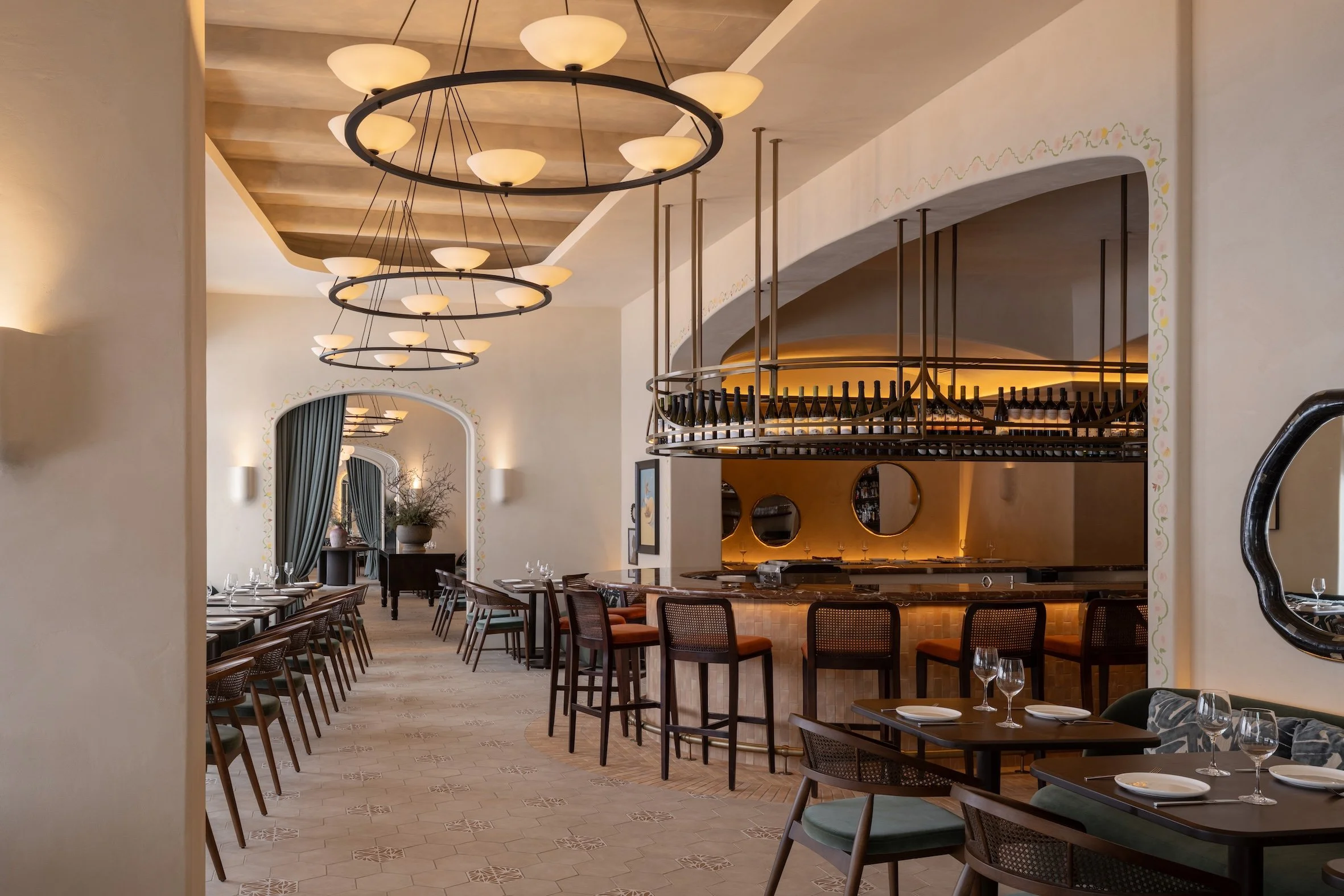 The main dining room blends custom cane-back banquettes, terracotta upholstery, and richly veined marble tabletops, evoking the relaxed luxury of a modern hacienda. A curated wine-wall installation and sculptural art moments punctuate the space, reinforcing Bocado’s connection to Spanish culinary culture.