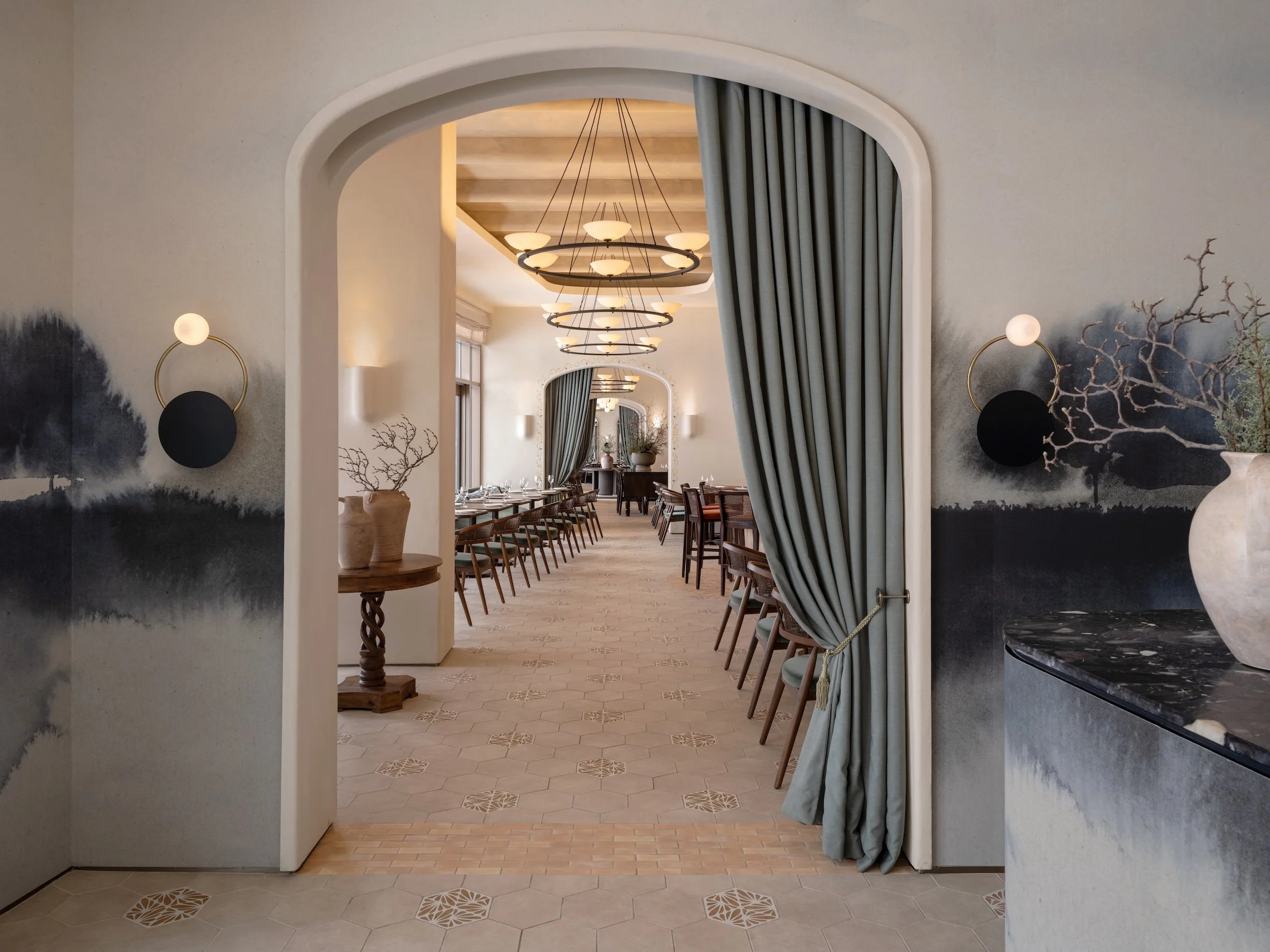 In contrast, the entry and lounge introduce an artistic, nature-inspired narrative through painterly wall finishes, soft drapery, and sculptural lighting. This palette of greens and deep blues brings a serene coastal energy to the design, offering a sense of discovery as guests move deeper into the restaurant.