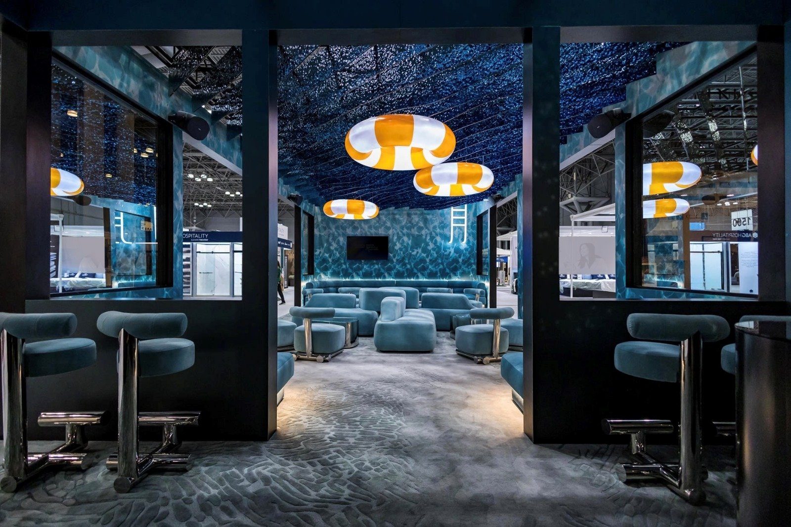 Playfulness runs through every design gesture, from the ripple-inset coffee tables to the sculptural, floaty light fixtures suspended above, giving the illusion of drifting pool toys captured mid-air. A central bar, outfitted in gleaming materials, invites guests to gather for a perfectly mixed cocktail or a quick hit of espresso before the next meeting or moment.